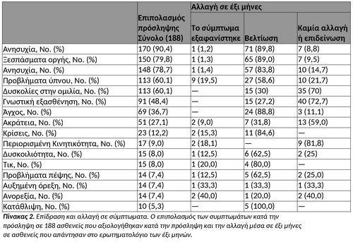 Κατά την έναρξη της μελέτης οι γονείς των 188 ασθενών ανέφεραν κατά μέσο όρο 6,3 ± 3,2 συμπτώματα. Ο Πίνακας 2 δείχνει την επικράτηση των συμπτωμάτων με τις πιο συχνές να είναι η υπερικινητικότητα (90,4%), οι εκρήξεις οργής (79,8%) και η ανησυχία 78,7.