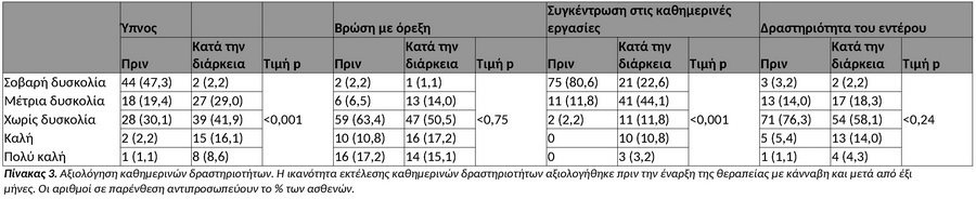 Για την ανάλυση της αποτελεσματικότητας χρησιμοποιήσαμε την προσέγγιση της συνολικής αξιολόγησης όπου οι γονείς των ασθενών ρωτήθηκαν: “Πώς θα αξιολογούσατε τη γενική επίδραση της κάνναβης στην κατάσταση του παιδιού σας;” οι επιλογές ήταν: σημαντική βελτίωση, μέτρια βελτίωση, ελαφριά βελτίωση, καμία αλλαγή, υποβάθμιση, μέτρια επιδείνωση και σημαντική επιδείνωση. Η αξιολόγηση της σοβαρότητας των συμπτωμάτων αυτισμού περιελάμβανε τα ακόλουθα στοιχεία: ανησυχία, εκρήξεις οργής, αδημονία, προβλήματα ομιλίας, γνωστική εξασθένηση, άγχος, ακράτεια, κατάθλιψη και πολλά άλλα. Η ποιότητα ζωής αξιολογήθηκε σε κλίμακα Likert scale με διακύμανση από πολύ κακή έως κακή, ούτε κακή ούτε καλή και καλή έως πολύ καλή(34).