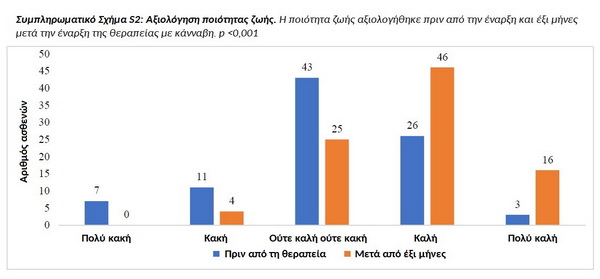 Παρακολούθηση, ενός μηνός. Μετά από ένα μήνα, από τους 188 ασθενείς, 8 (4,2%) σταμάτησαν τη θεραπεία, 1 (0,5%) άλλαξε σε διαφορετικό προμηθευτή κάνναβης και 179 ασθενείς (94,6%) συνέχισαν την ενεργό θεραπεία (Εικόνα 1). Από την τελευταία ομάδα, 119 (66,4%) απάντησαν στο ερωτηματολόγιο 58 ασθενείς (48,7%) που ανέφεραν σημαντική βελτίωση, 37 (31,1) με μέτρια βελτίωση, 7 ασθενείς (5,9) είχαν ανεπιθύμητες ενέργειες και 17 (14,3) ανέφεραν ότι η κάνναβη δεν τους βοήθησε.